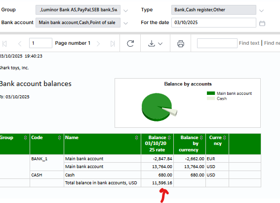 Before assessing the impact of exchange rate changes, it is necessary to ensure that the amounts in the currency are reconciled with the bank statement. Then the bank account balance report shows the balance at the exchange rate of the relevant day: