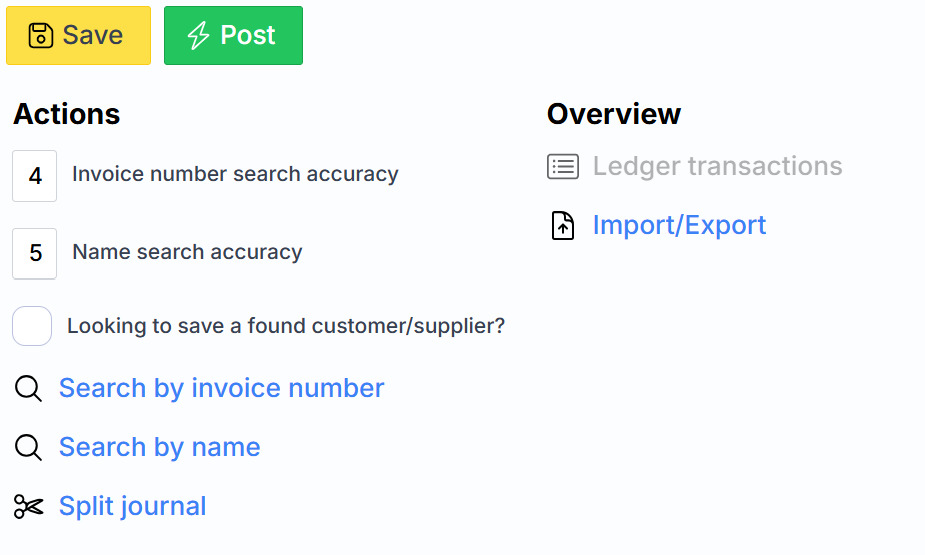 Search by name – breaks the transaction text by spaces into words and searches among the customer/supplier names for those words whose length is greater than specified in the Name search accuracy field .