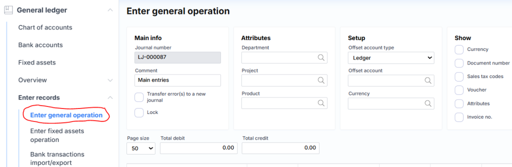 The main journal through which any transactions can be posted (except inventory). The upper part consists of the following fields: