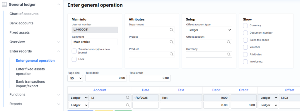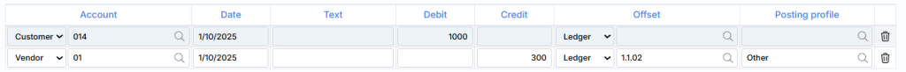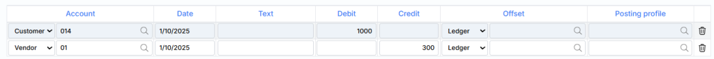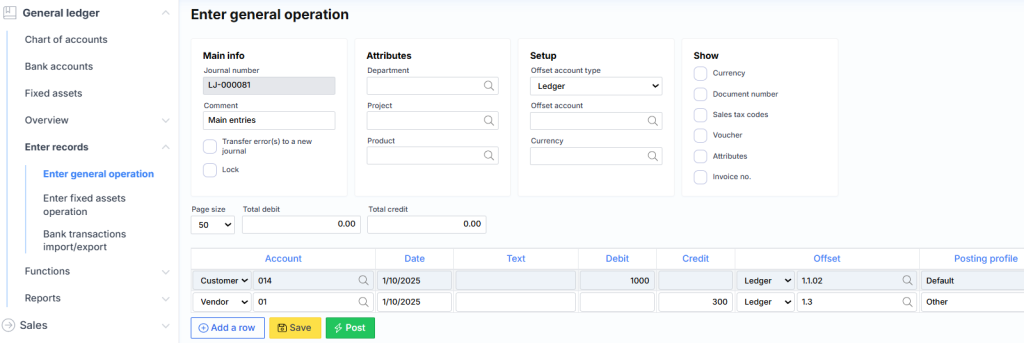 Any transaction can be entered through the general journal, as long as it is not related to goods. This journal is most often used to enter accounting transactions, a set-off between a supplier and a customer or different customers/suppliers, a debt write-off, or a transaction related to the closing of the year. Below are some examples of when a set-off is entered. This example reflects a situation where a set-off is made with the same G/L links:
