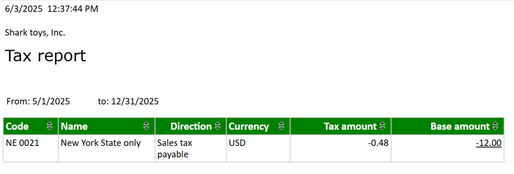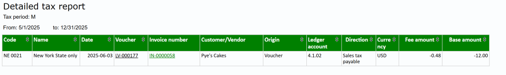 It shows receivables and payables according to VAT rates. By clicking on the number in the Base amount column , you can see the details: