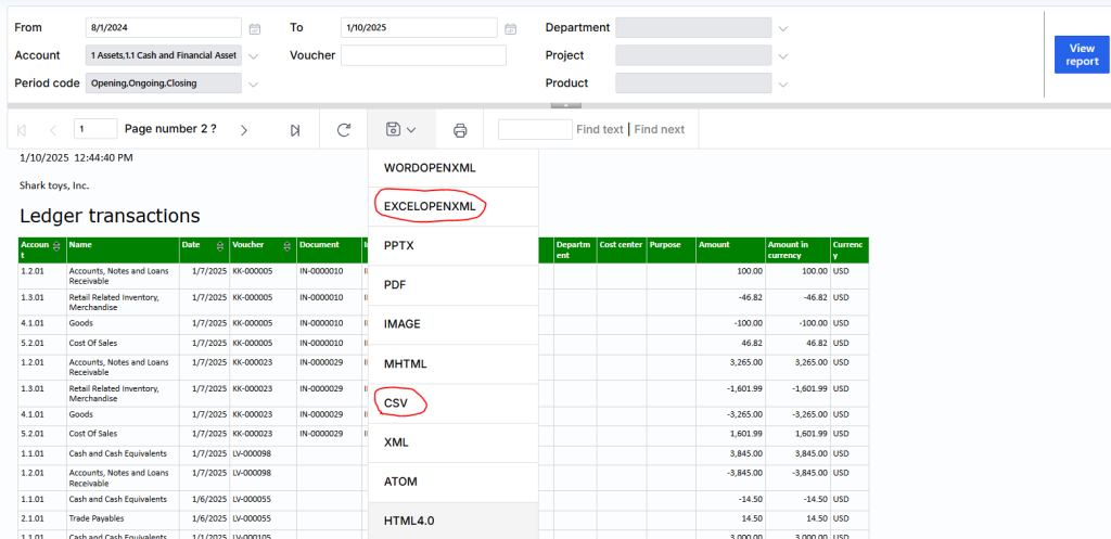 Second, after generating the report, press Save icon and click on EXELOPENXML or CSV: