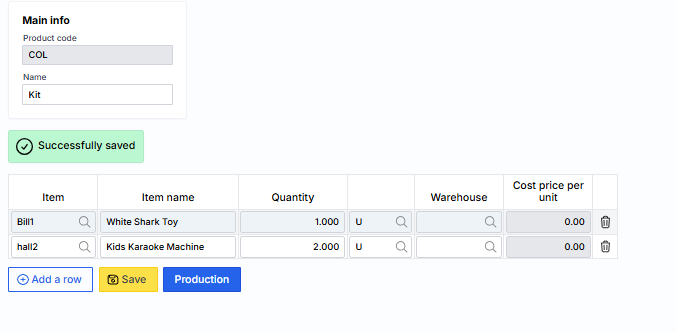 Once this is done, you can register the production (assembly) procedure. It is called up in the same assembly form or on the item (product) card by clicking the Produce link :