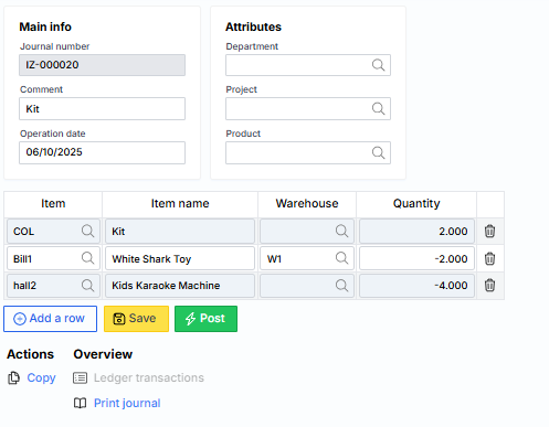 Once this journal is posted, the appropriate quantities of items (raw materials) will be written off and the specified quantity of products will be acquired.