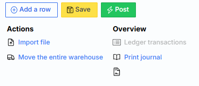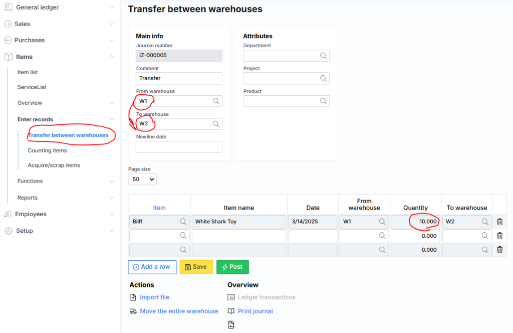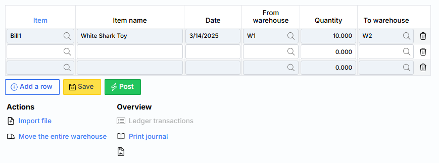 This journal type is used to transfer items between warehouses or between other dimensions (batch and package), if used. The upper part consists of: