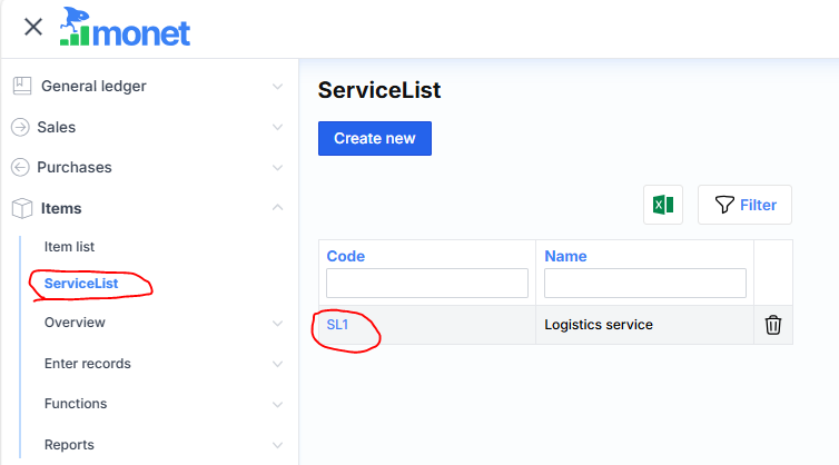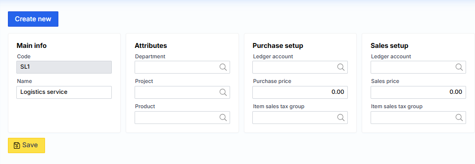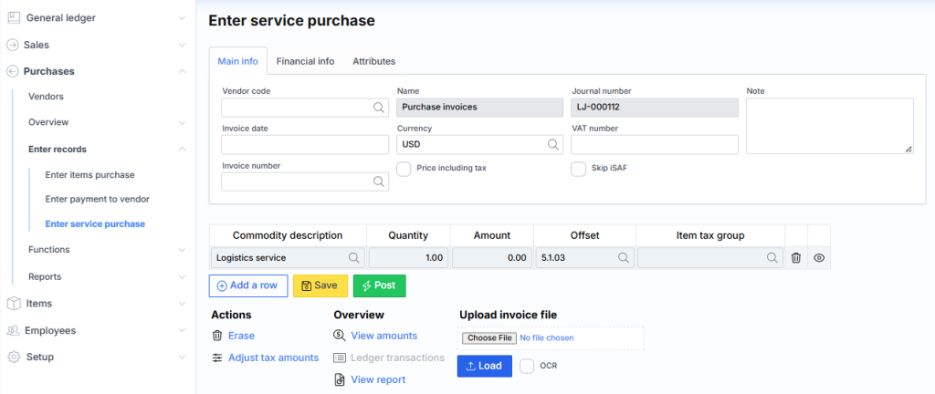 After signing up in this way, when conducting a purchase or sale, the desired service can be selected from the list and the system fills in the corresponding DK account, name, amount and VAT code and attributes.