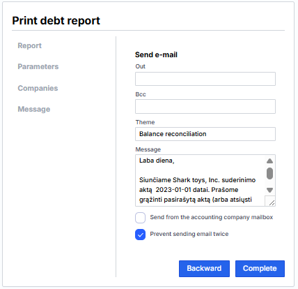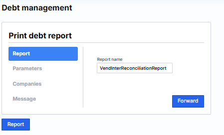 All suppliers who have e-mail can send debt reconciliation reports here . In the Report name field , you can leave it unchanged, or you can enter another desired report, e.g. detailed VendInterReconciliationDetailReport