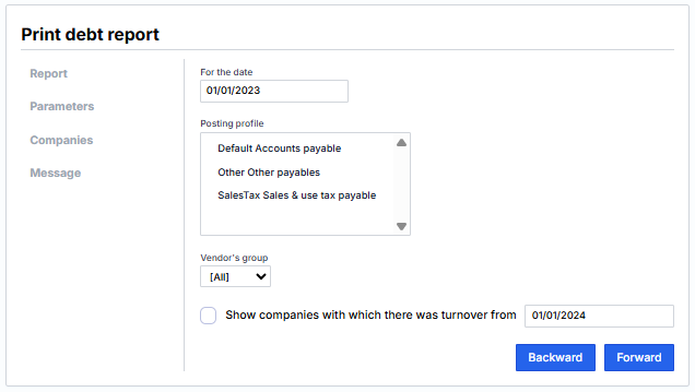 Next, click Parameters to specify the date for which you want to generate debt reconciliations, e.g. 01/01/2023.