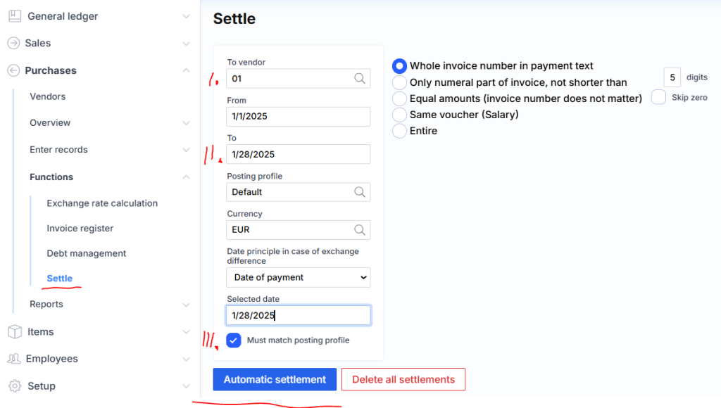 Automatic settlement of supplier transactions can be found in the menu: Purchases/Functions/Settle