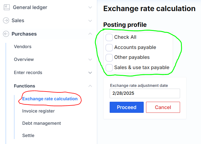 The unrealized foreign exchange rate change evaluation for supplier transactions is performed in this form (highlighted in red):