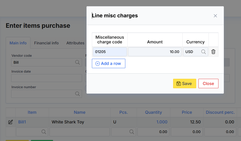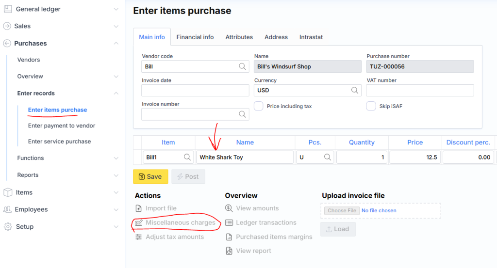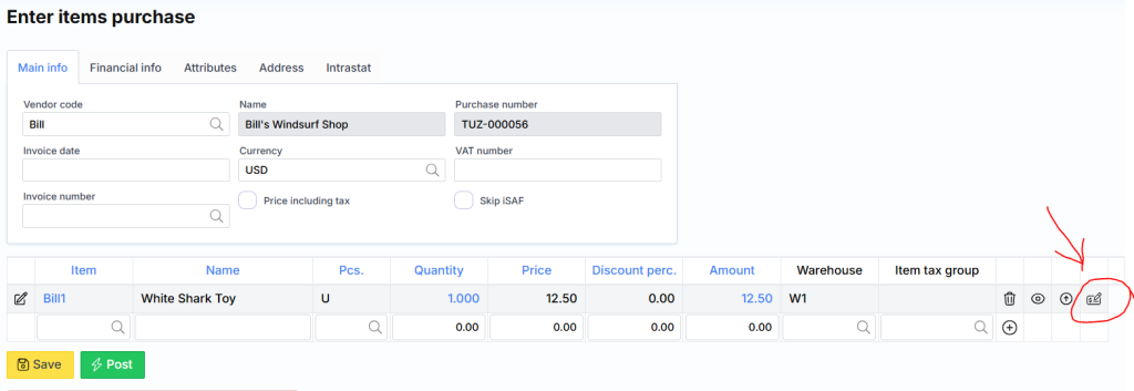 Sometimes, when entering a purchase, the item cost price needs to be increased by additional expenses such as customs duties, delivery costs, etc. Additional expenses can be assigned in two ways: