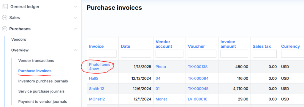 Additional expenses can also be assigned to a registered invoice. In that case, locate the invoice via: Menu → Purchases → Review → Purchase Invoices