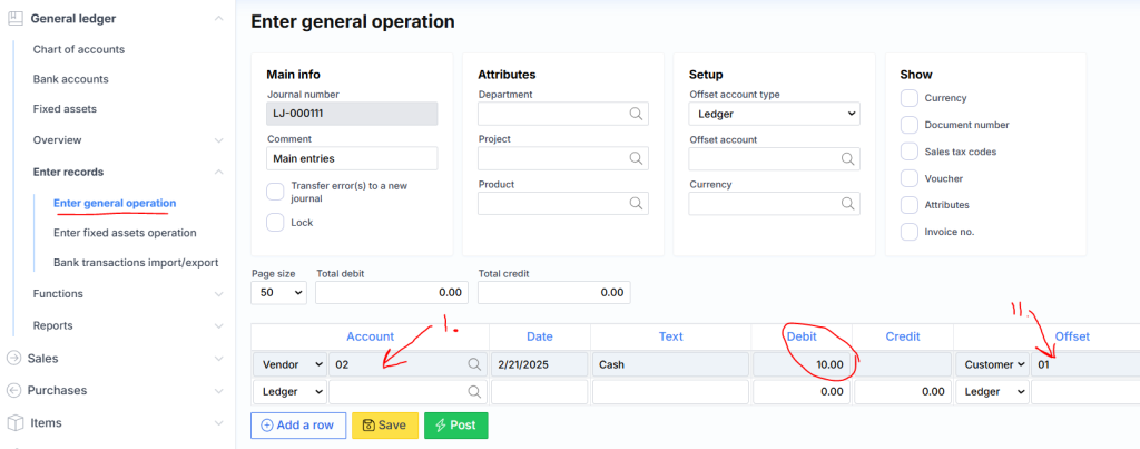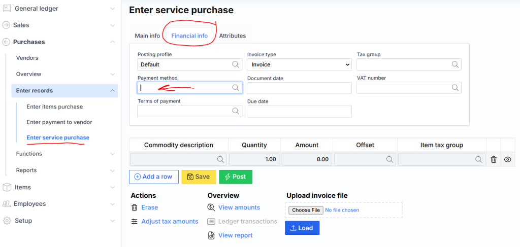 If the purchase has already been registered and the payment method was not specified, then an additional entry must be made: Menu\General Ledger\Enter Records\Enter General Transaction