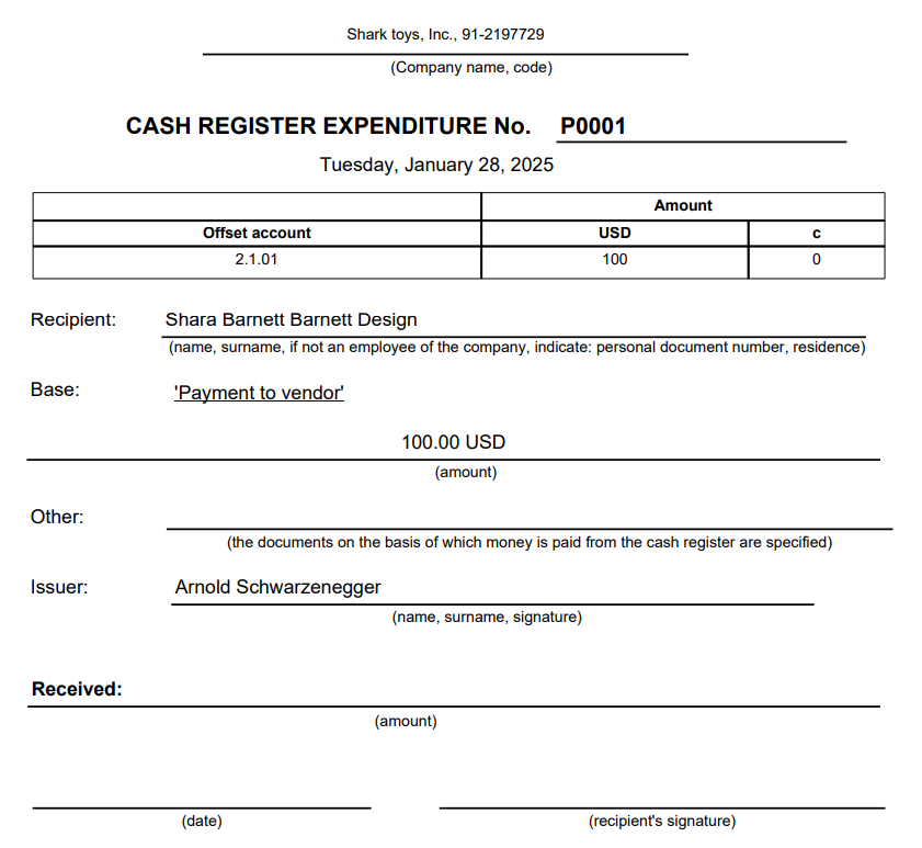 Print cash receipt order – will generate a cash receipt order. The document itself will look like this: