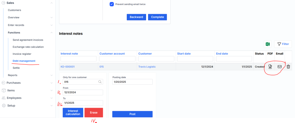 Clicking on the PDF icon opens the interest calculation document-invoice. The email icon allows you to send the interest invoice directly to the client.