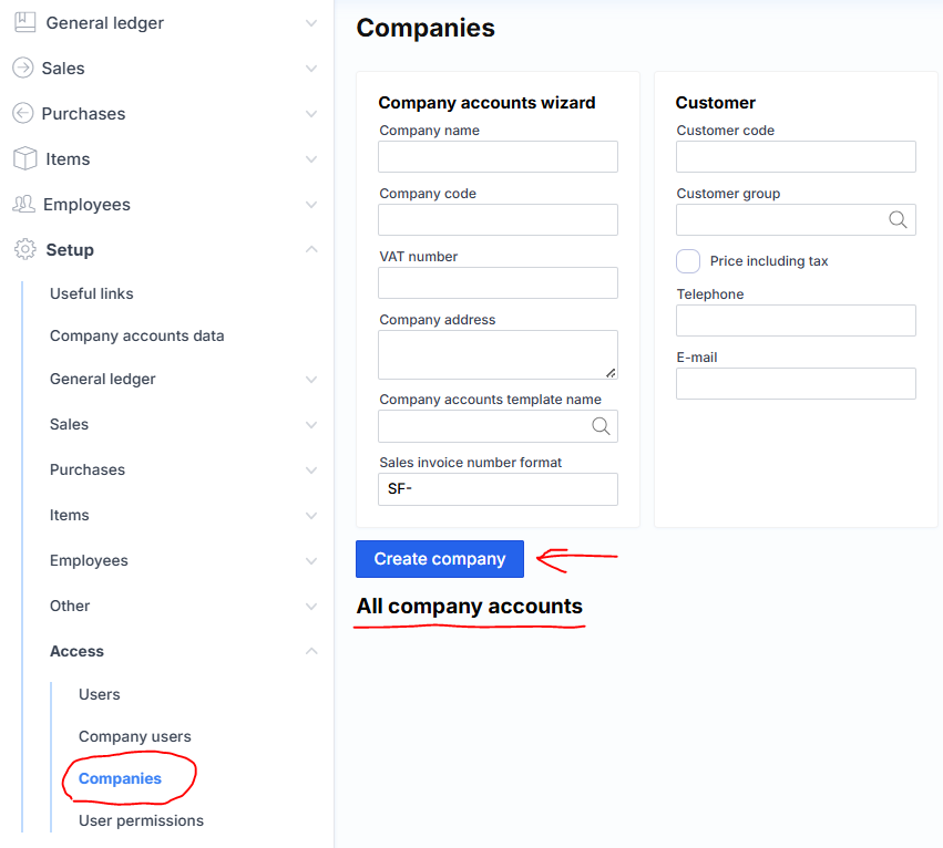 The lower part of the form displays a list of companies that have already been created