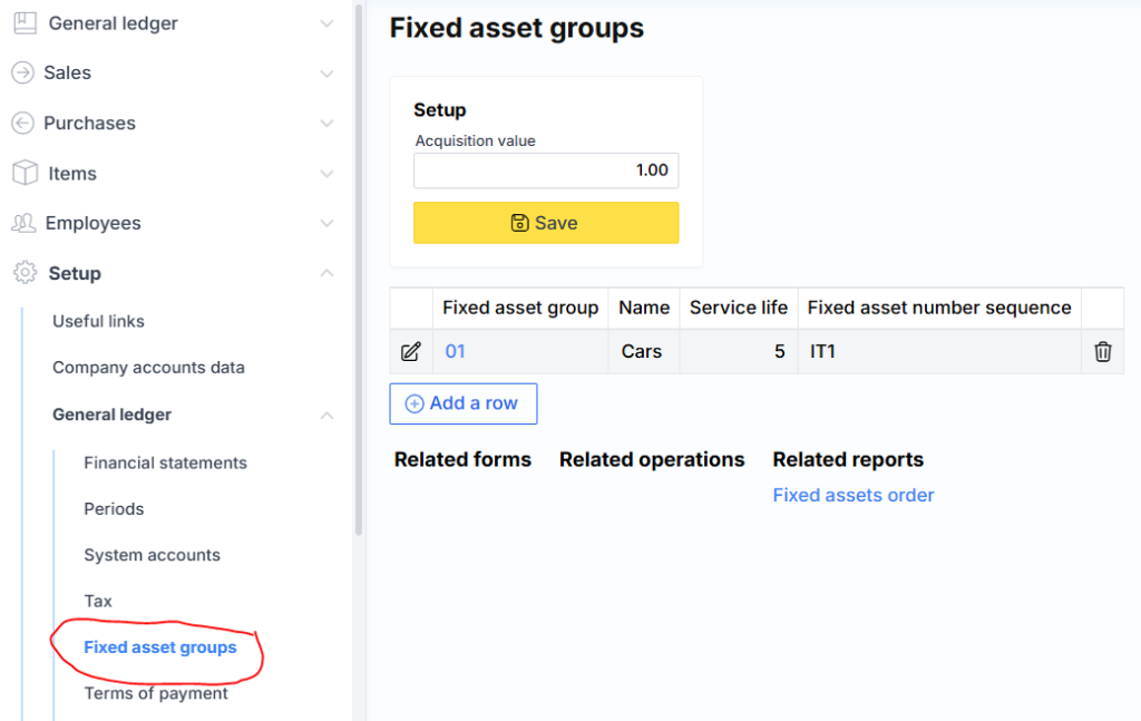 Fixed asset groups are specified in this form.
