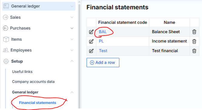 By clicking on the corresponding financial report code, you are taken to its configuration window, where the report lines are displayed.