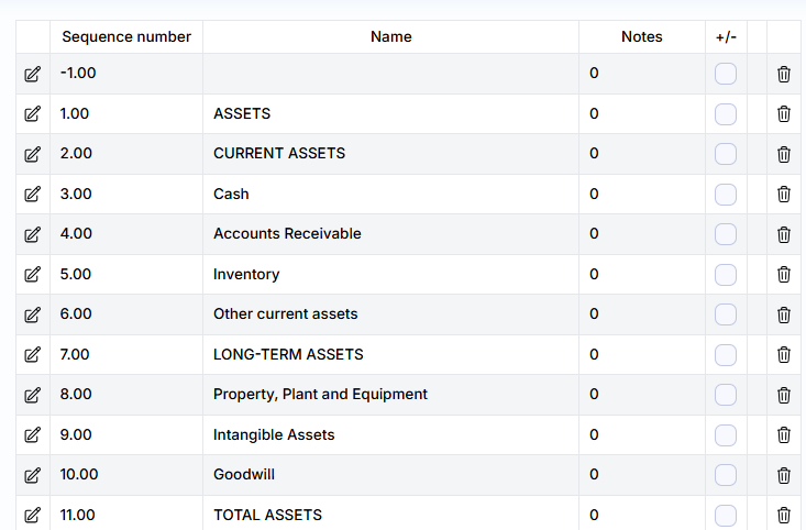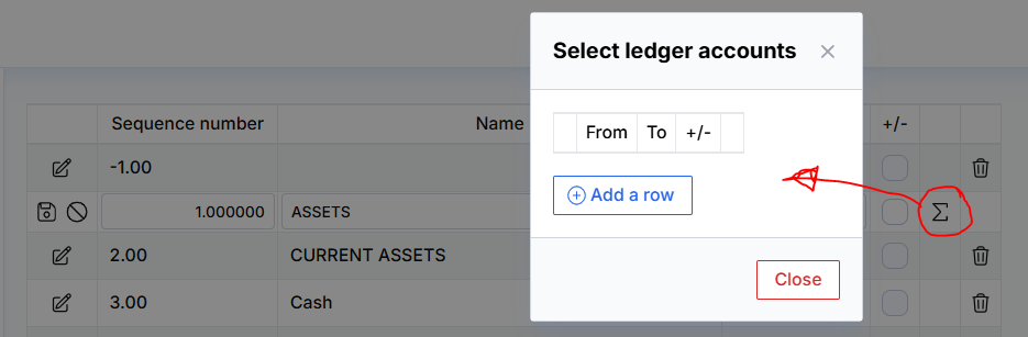 Report Line Composition – the breakdown of the report line (i.e., which general ledger account amounts it consists of) is accessible by clicking the edit icon and then the amount icon in the opened editing row.